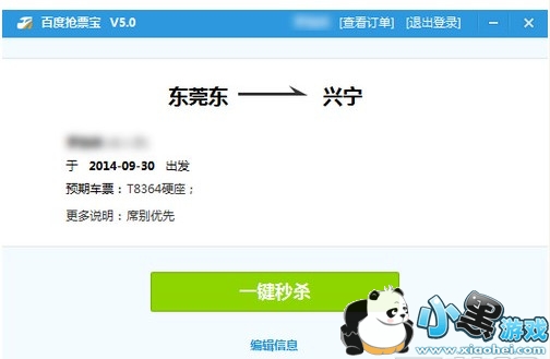 3、信息确认无误,点击【一键秒杀】开始抢火车票吧!