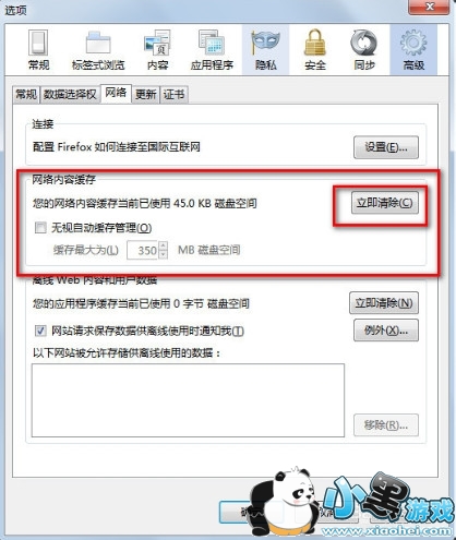 4、然后再点击进入“高级”—“网络”,在“网络内容缓存”中点击“立即清除”;如果离线Web内容和用户数据下也有需要清除的,点击“立即清除”,然后点击“确定”
