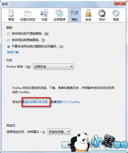 2、进入“选项”界面后点击进入“隐私”设置,点击下面的“清空近期历史记录”或者“删除个人Cookie”
