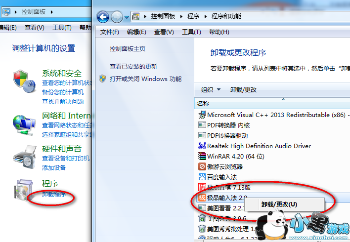 方法二:开始菜单==控制面板==卸载程序==找到“极品五笔”右击卸载/更新