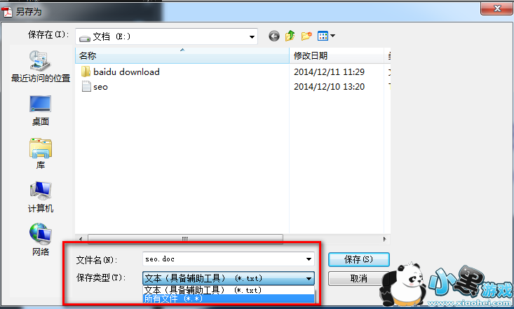 2、在弹出的对话框中选择保存类型为所有文件,然后在文件名后加.DOC,单击“保存”