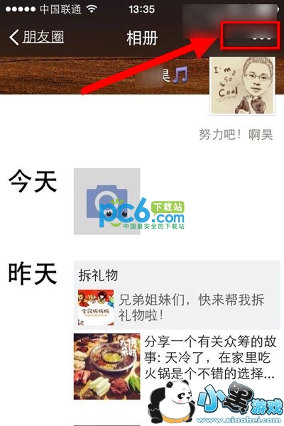 2、进入朋友圈“相册”里面,看到右上角有一个按钮。注意:这里iPhone版本和Android版的图标是不同的,但是功能一样。