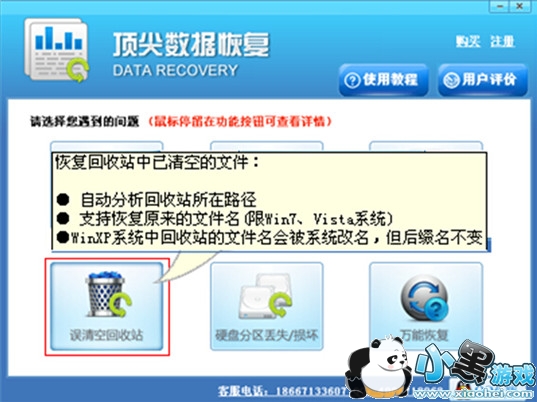 第一步:单击"误清空回收站" 模式,本模式可以恢复:清空回收站丢失的文件。