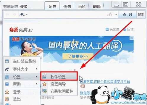 2、在有道词典面板的左下角点击 “设置”==软件设置