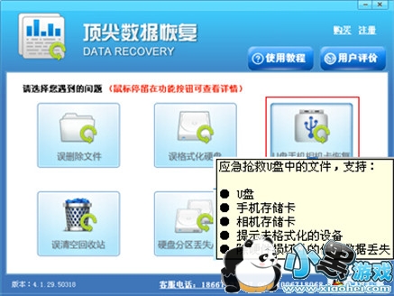 第一步,打开软件,选择第三个选项,即“U盘手机相机卡恢复”这一功能按钮。
