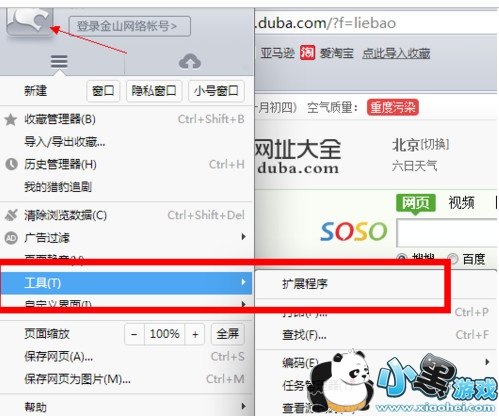 1、打开你的猎豹浏览器点击左上角的猎豹图标。会看到“工具”,在工具里选择拓展程序。