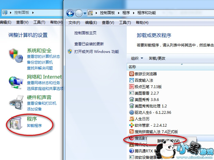 方法二:开始菜单“控制面板” 卸载程序,右击“搜狐影音”点击卸载更新。