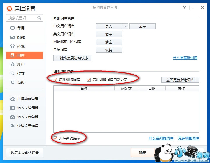 3、在属性设置中选中【词库】——取消【开启新词提醒】【启用细胞词库自动更新】——【确定】;词库更新让可以通过设置实现后台自动更新,没必要开启提醒这样只会增加弹窗;
