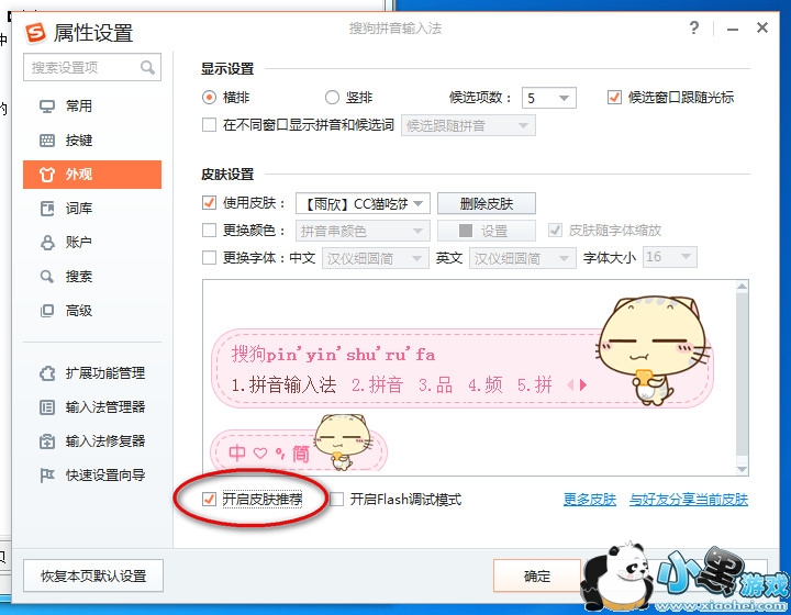 2、在属性设置中选中【外观】——取消【开启皮肤推荐】——【确定】;当需要更换皮肤时可以自行去更换;