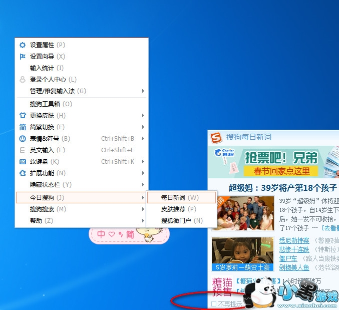 5、右键单击左侧选中【今日搜狗】——每日新闻——搜狗每日新词——勾选不再提示;