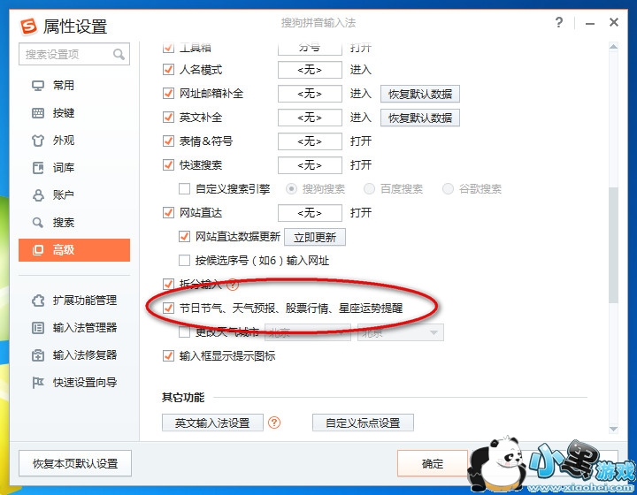 4、在属性设置中选中【高级】——取消勾选【节日节气、天气预报、股市行情、星座运势等提醒】——【确定】