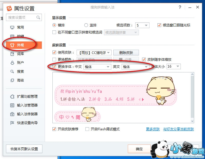 2、在“属性设置”对话框中选择“外观”选项卡中的勾选“更换字体”然后在右边设置你要的中英、文字体以及字体大小单击确定