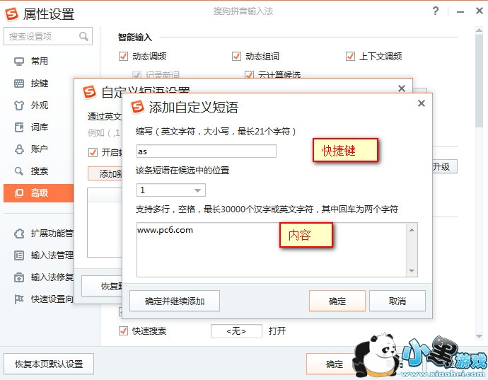4、我们需要设置短语的快捷键,参照下图,建议使用组合键,避免和其他短语快捷键出现冲突;同时需要设置短语的排序,此处排序应用在输入法输入结果的排序;最后设置相应的快捷短语