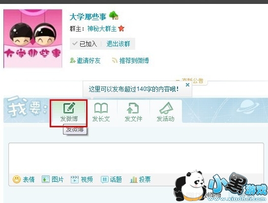 步骤四:由于只能在加入的微群里发微博,进入之后可以点击发布微博按钮,在微博框中输入你想输入的文字,这里跟发布常规微博一样,可以插入图片,编辑之后点击发布即可,如图所示。