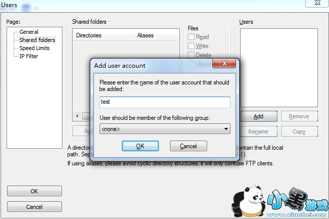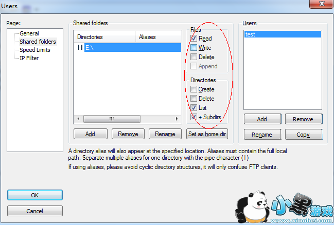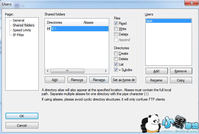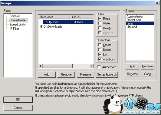 比如本例,主目录是D:/Downloads,如果不做虚拟路径设置,那么客户端登录进来只能看到主目录里面的内容,还有一个E:/FTPRoot目录下面的东西看不到。如何设置虚拟路径?鼠标右键点击列表中的“E:/FTPRoot”目录,在弹出的菜单里面选“Edit aliases”编辑别名;现在要把E:/FTPRoot目录作为客户端主目录下的FTPRoot目录,那么就在弹出的窗口里面输入“D:/Downloads/FTPRoot”并点击“OK”按钮确定。注意拼写规则,路径的前面部分必须是主目录的绝对路径。这样设置之后,在客户端就可以看到一个“FTPRoot”目录,这个目录其实就是E:/FTPRoot目录。