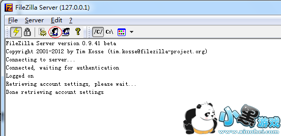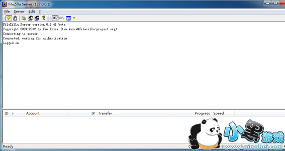第8步 如图,出现FileZilla伺服器管理介面后,我们可以在视窗上半部看到目前的FTP伺服器的运作状况,如果有出现「Logged on」或「Server online」的字样,表示已经顺利上线。我们可以随时点按上方的闪电图示切换上线、离线,即可手动开启或关闭FTP站。