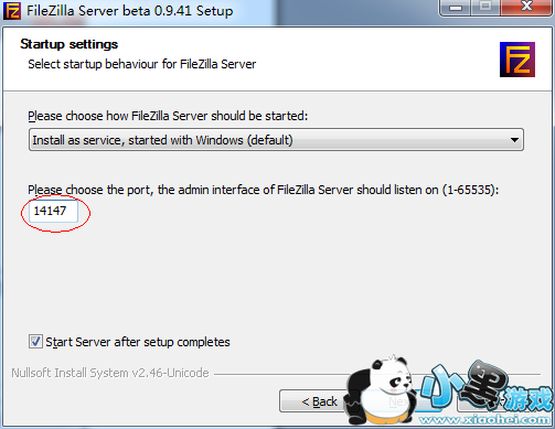 第4步 此步骤是询问我们是否要让FTP伺服器在电脑开机时自动启动,请点选【Install as service, started withWindows (default)】,再按一下〔Next〕。这样FTP伺服器便会自动被安装成系统的Service,每次开机后便会自动再背景中启动并执行FTP伺服器的功能。设置管理端口“14147”,强烈推荐修改此端口,例如:改成38121端口。(注意不要和常见服务如80端口冲突)