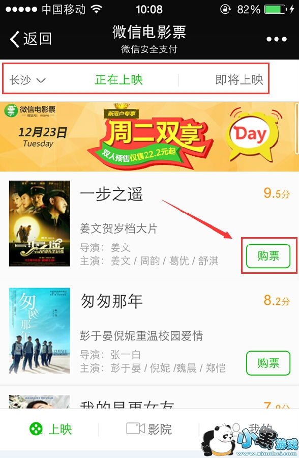 4.进入电影票界面后就可以选择正在上映和即将上映的电影啦。最左边还可以选择你所在的城市。小编在长沙,所以选择长沙,然后想看葛大爷的《一步之遥》,选择购票。