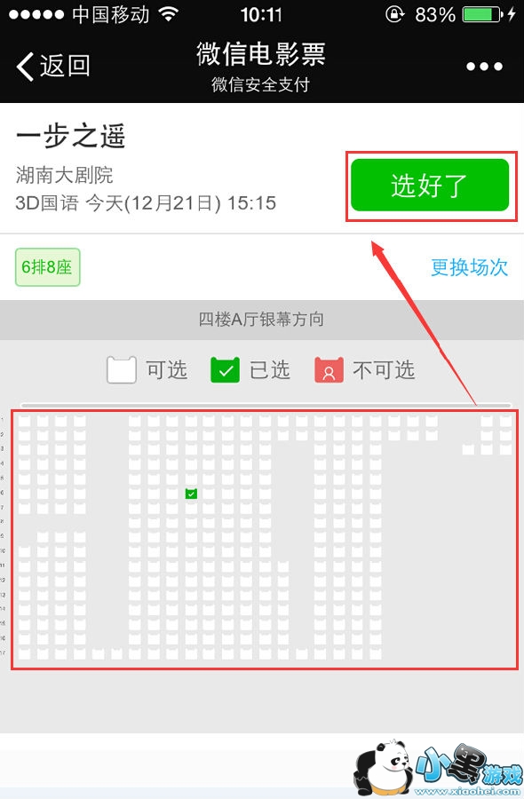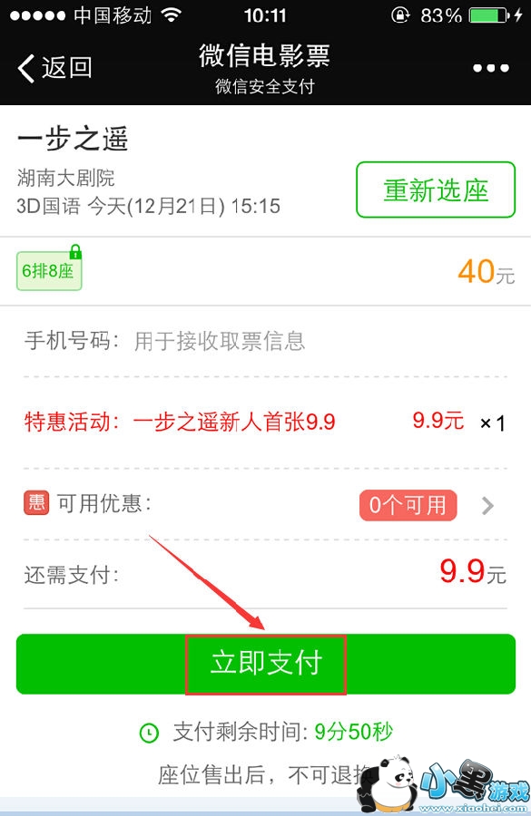 7.最后就是选座位和支付啦。选完后点“选好了”,然后点立即支付,ok,9.9元电影院搞定。是不是很简单呢?需要注意的是,座位售出后,不可退换哦。