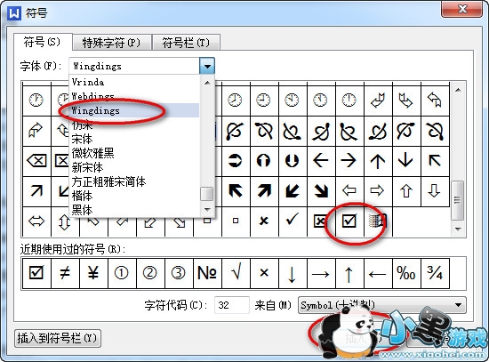 2、然后我们进入符号“对话框”选择“符号”选项卡在字体中选择“wingdings”,将滚动条拖到最后选择我们想要的“方框中打勾”的那个符号。点击“插入”