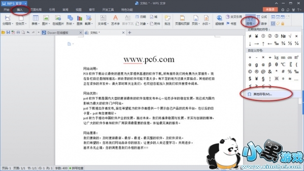 1、首先我们打开WPS中的文字,进入“插入”菜单,点击“符号”的下拉菜单选择“其他符号”