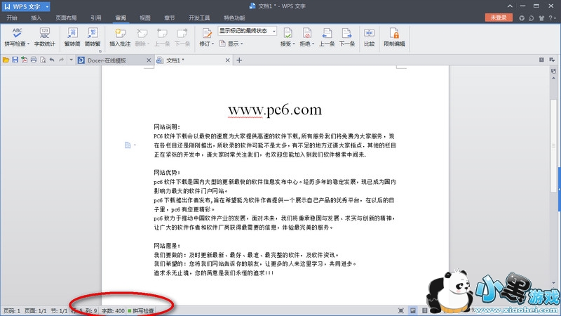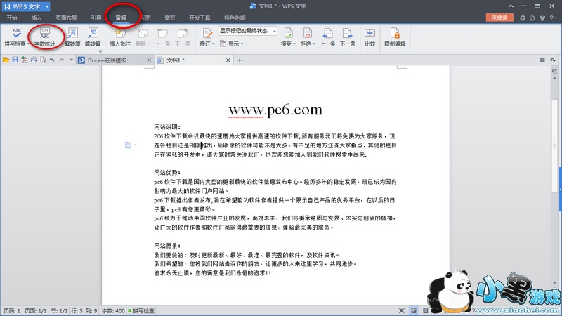 3、我们也可以在菜单栏点击“审阅”上面看到有一个“字数统计”的按钮