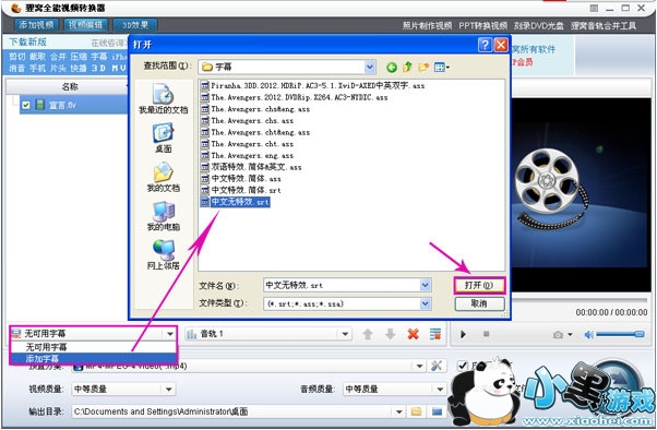 2、应用软件左边的“字幕”按钮,可以把字幕文件添加到视频中,软件可以支持添加srt、ass、ssa格式字幕。