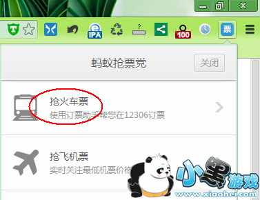 2、点击蚂蚁chrome浏览器右上角的抢票按钮,点击【抢火车票】