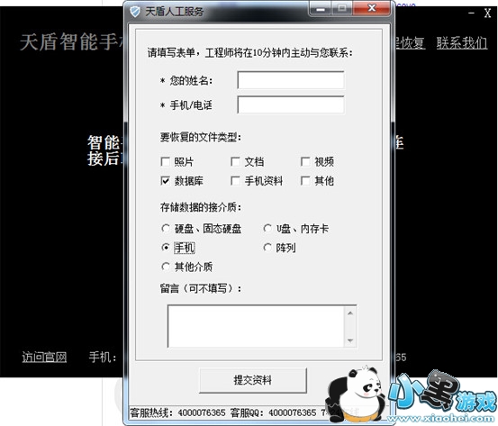 第六步:填写提交人工服务表单,天盾数据恢复中心的工程师会尽快跟用户联系,为用户解决手机数据丢失问题。