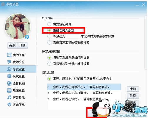 步骤二:在弹出的对话框中选择“好友设置”点击“拒绝任何人添加”点击确定。