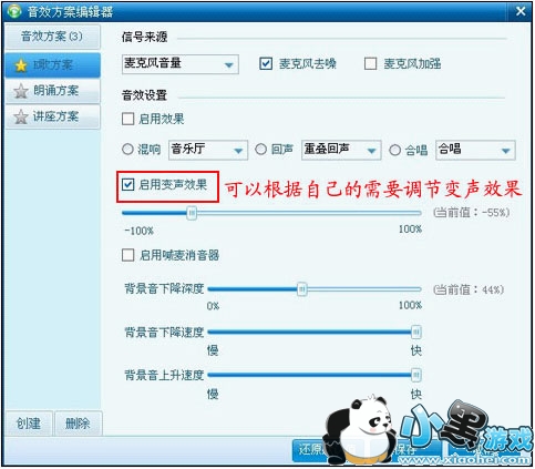 d. 如果您想使用“变声”功能请把前面的小方框勾选上即可使用,往左可以使您的声音变得深沉、沉重比较低;往右可以使您的声调变高、变细。放置中间可以保持您的原声不变。下图: