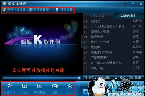1、单击播放器左下方(红框中)可快速启动视频、幻灯片、屏幕捕捉、乐库等等。左上方可快速启动视频特效设置、幻灯片设置、视频设置。下图: