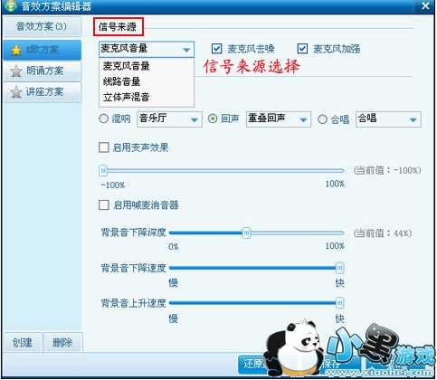 “信号来源”中包括:CD音量、麦克风音量、线路音量、立体声混音。您可以根据需要选择输入源。如果声音有噪音和说话声音小可以选择“麦克风去噪“麦克风加强”下图: