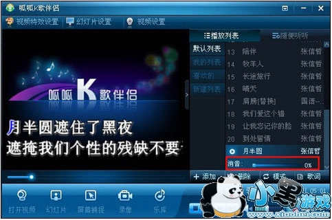 点击歌曲会出现消音功能,在消音处按钮滑动到0%时是原唱相反按钮滑到100%的时候是伴奏,纯音乐,用户可以随意调节自己想要的音乐效果。下图: