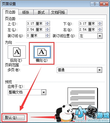 2.将纵向改成横向,另外最下面默认也要点一下,不然你这次改完后下次再打开word文档又得重新设置。最后确定即可。