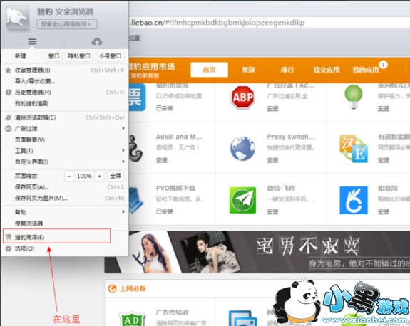 1、首先打开你的猎豹浏览器找到猎豹浏览器左上角的方框(原始的会是一个猎豹的标志),会出现一个下拉框,找到猎豹应用商店