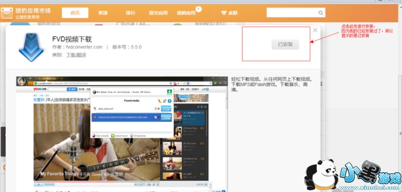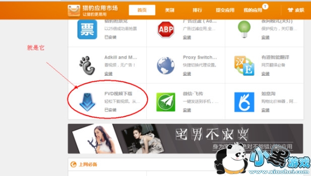 2、进入到猎豹猎豹商店你会看到有很多的应用,找到flv这个应用,点击flv这个应用,点击右上角的安装标志进行安装