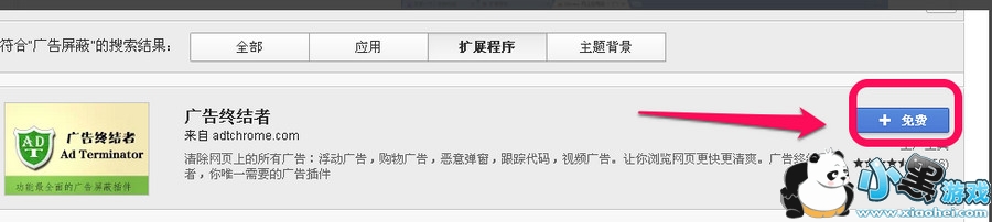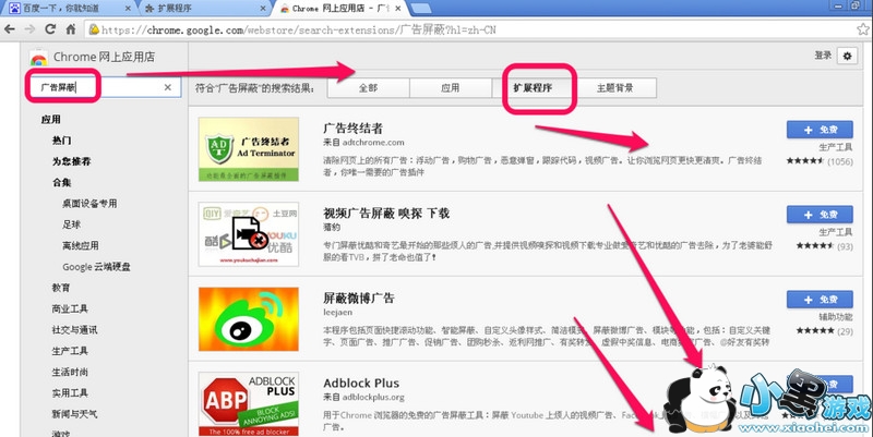 3、进入网上应用店之后,我们在左边搜索栏里,搜索“广告屏蔽”,右边结果里,在扩展程序里寻找,适合我们自己的一款应用就可以了