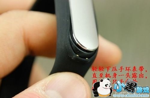 2、将手环拿在手中,左手向下轻压表带,使机身一头露出,右手顺势将机身由表带上抠下。注意用力,小心用力过猛机身脱手。