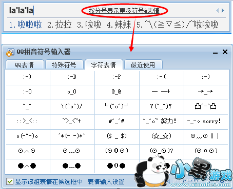 3、有时候,想要其他特殊符号,但不知道怎么打,也可以按照步骤1先打一个啦啦啦。然后在拼音上面会有一个“按分号显示更多符号&表情”。点击就能看到很多特殊符号和表情了。如下图所示。