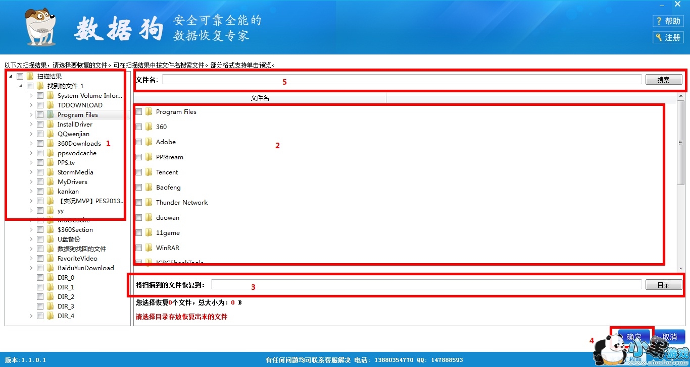 第四步:待扫描完成后,软件自动进入“恢复文件选择界面”,如下图所示。如果您想要恢复移动硬盘里的所有资料,那么请在区域1内的菜单栏中选中所有文件夹;如果您只需要恢复移动硬盘里的部分资料,您可以在区域1内选中您需要恢复的文件原存放的文件夹,然后再区域2内找到并选中您需要恢复的文件,您也可以尝试使用区域5内的搜索功能,直接将您需要的文件显示在区域2内。找到您需要的文件后,单击文件名还可以对文件进行预览。接着,在区域3内选择文件恢复后的保存路径,为保证恢复成功,请勿将恢复数据的保存位置设置为您格式化的移动硬盘。完成上述步骤后点击区域5内的确定。