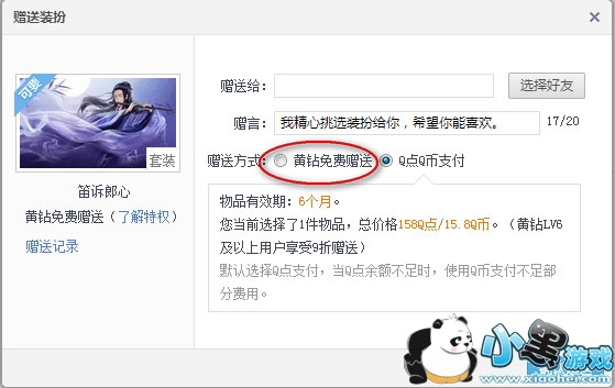 3、接着选择要赠送的好友,并且选择“黄钻免费赠送”项,最后点击“确认赠送”按钮即可。当然,对于装扮的赠送,也支持Q点/Q币赠送方式,这就需要我们去充值了。