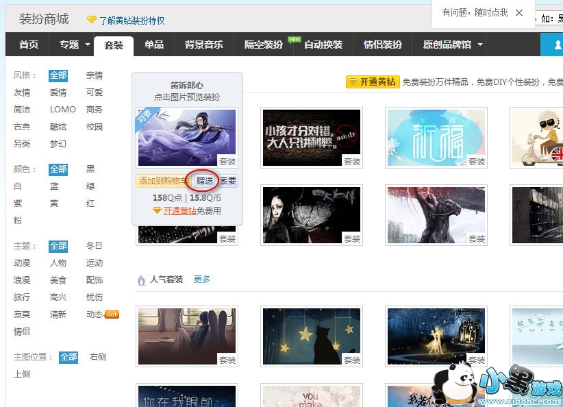 2、接着在“装扮商城”最下面找到“套装”当鼠标悬停在相应的装扮上时,就会出现“赠送”按钮,点击即可向好友赠送。