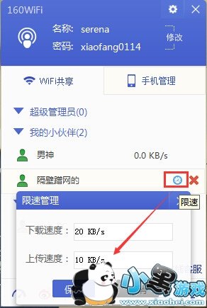 将鼠标移至“隔壁蹭网的”小伙伴,会出现限速管理按钮,打开按钮,将弹出管理窗口。如下图,可分别将下载速度和上传速度进行限制,设置好限制速度,将其保存。即可将该位小伙伴的网速限制起来。无论他在手机上看视频还是玩游戏,都不会再抢占自己手机的网速了。