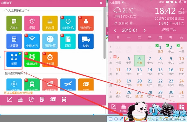 只要你在电脑上安装了人生日历,就能在任何环境下轻松截图。点击截图按钮,选好需要截图的区域后就会弹出一个工具条,你可以在工具条里任意选择记号笔,马赛克等画图小工具来制作你需要的截图。