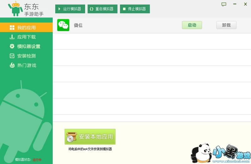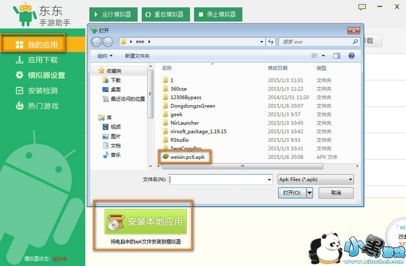 第一步:等东东手游助手和安卓版的微信下好以后,我们开始连接电脑吧,先选择我的应用,然后安装本地应用,选择安卓版的微信