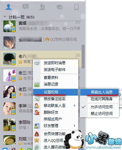 首先我们登录QQ,进入好友列表。选择你想要暂时屏蔽的好友,右击“设置权限”,然后点击“屏蔽此人消息”。
