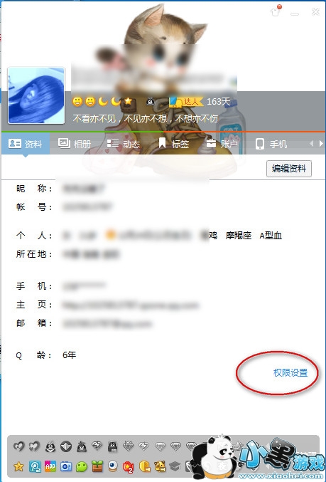 2、进入“个人资料”中,我们点击右下角“权限设置”