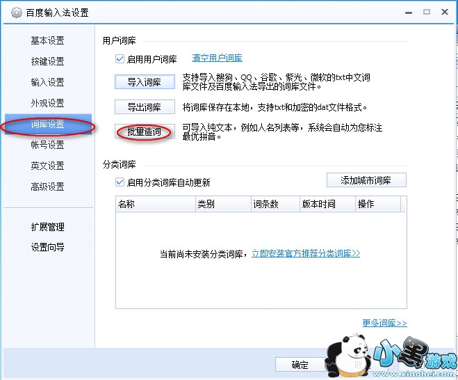 3、然后在弹出对话框的左侧,点击“词库设置”-》批量造词