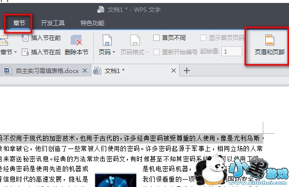 1、首先我们打开文档,输入你想要设置页面页脚的文字,点击“章节”菜单--选择“页眉和页脚”,整片文档进入页眉页脚编辑模式。